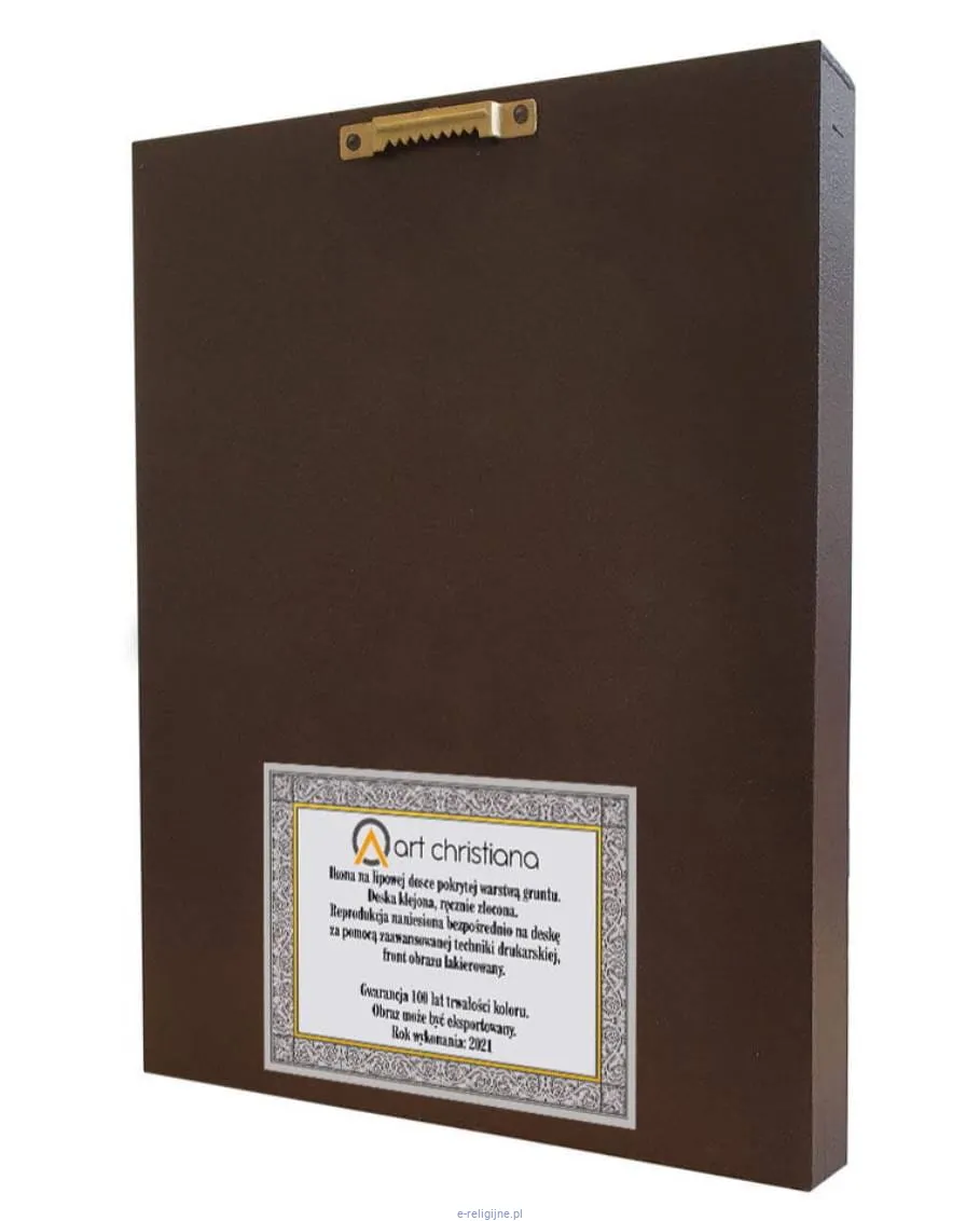 Wizerunek został naniesiony ręcznie przy użyciu specjalnej techniki bezpośrednio na deskę.