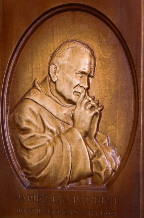 Płaskorzeźba z wizerunkiem błogosławionego Jana Pawła II i wezwaniem "Boże błogosław ten dom".