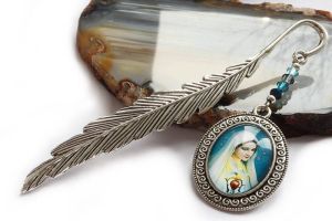Stylowa metalowa zakładka do książki, kalendarza, notesu, Biblii z jubilerską zawieszką z wizerunkiem Najświętszego Serca Pana Jezusa.