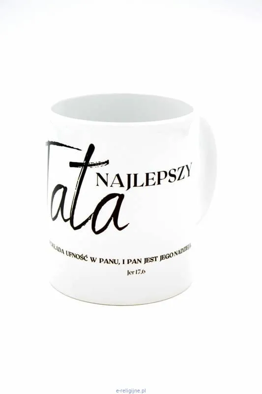 Kubek dla taty z biblijnym cytatem z Księgi Proroka Jeremiasza: "Błogosławiony mąż, który pokłada ufność w Panu, i Pan jest jego nadzieją"