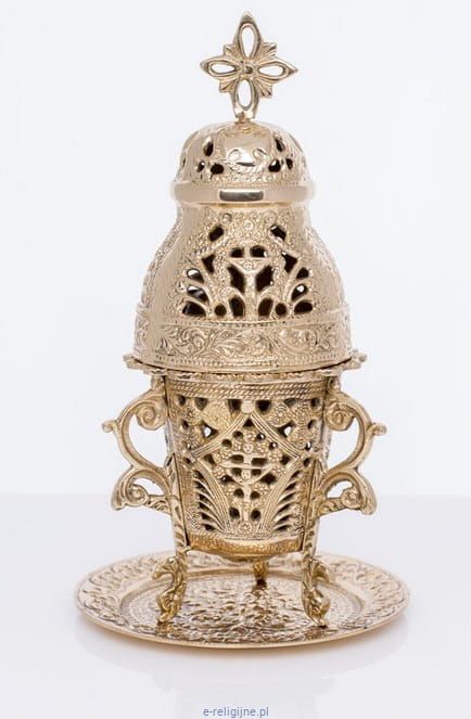 Kadzielnica mosiężna do użytku domowego. Bogato zdobiona. Wysokość z krzyżem 23 cm.