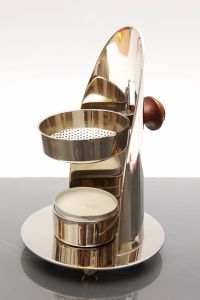 Niklowana kadzielnica z możliwością regulacji wysokości tacki z kadzidłem. Po nagrzaniu na niższej wysokości jest możliwość podniesienia pojemnika na kadzidło wyżej, aby zapach uwalniany był powoli.