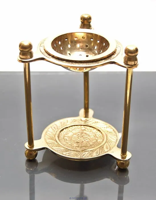 Kadzielniczka domowa w kolorze złotym ze zdobieniami na podstawie. Po umieszczeniu w dolnej części kadzielniczki podgrzewacza tzw. tealight'a, w górną część należy nasypać kadzidło. Wysoka temperatura spowoduje spalanie i uwolnienie zapachu.
