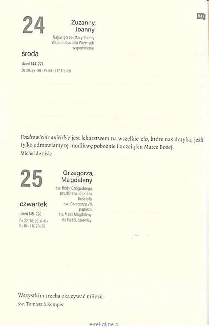Praktyczny i pomocny terminarz na 2023 rok zawierający najpiękniejsze myśli na każdy dzień z książek należących do „Pereł Duchowości”, czyli klasycznych tekstów chrześcijańskich wydanych w nowym przekładzie, takich jak: Wyznania św. Augustyna, Traktat o prawdziwym nabożeństwie do Najświętszej Maryi Panny św. Ludwika de Montfort czy O naśladowaniu Chrystusa Tomasza à Kempis.
