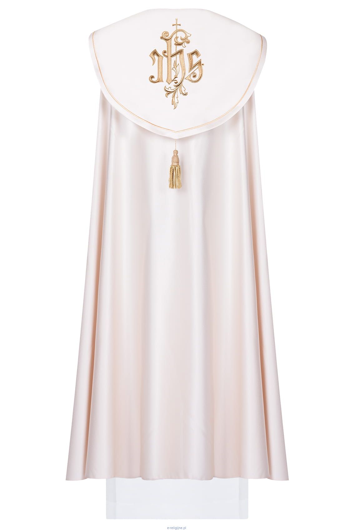 Kapa liturgiczna do nabożeństw wykonana z wysokiej jakości tkaniny gładkiej satynowej. Zdobiona haftem z symbolem IHS.