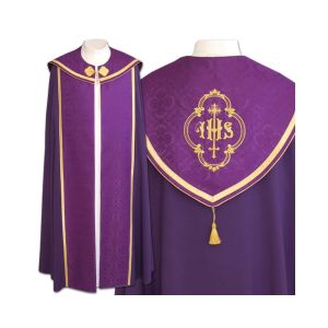 Żakardowe kolumny z przodu i kaptur z haftem IHS obszyte są złotą taśmą ozdobną.