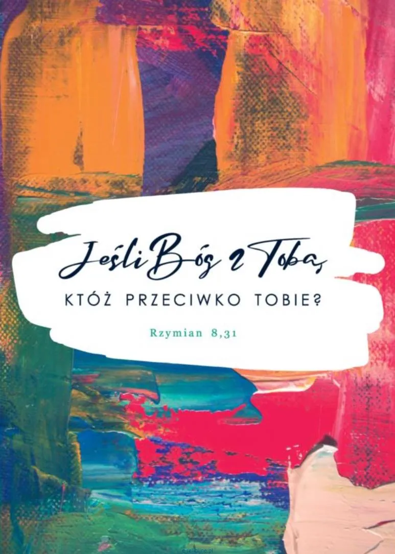 Kartka zawiera biblijny cytat: Jeśli Bóg z Tobą, którz przeciwko Tobie? Rz 8,31