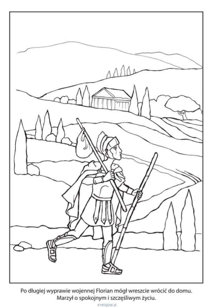 Pierwsza połowa książki prowadzi dziecko przez życie świętego Floriana — rzymskiego oficera, który w IV wieku odmówił prześladowania chrześcijan i za to zapłacił życiem. Teksty są krótkie, jedno-dwa zdania pod ilustracją.
