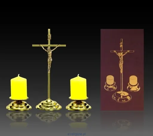 Zestaw komplet kolędowy z mosiądzu. W skład kompletu wchodzą krzyż, dwa świeczniki, a także dwie świece.