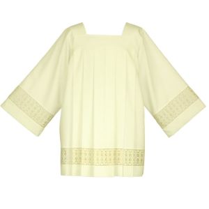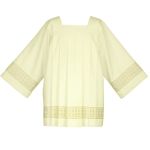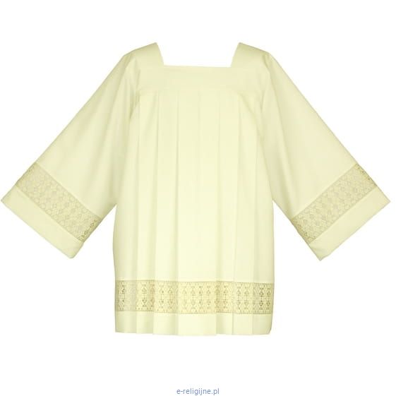 Komża kapłańska w kolorze ecru zdobiona bawełnianą wstawką. Dostępna w następujących rozmiarach (wzrost):