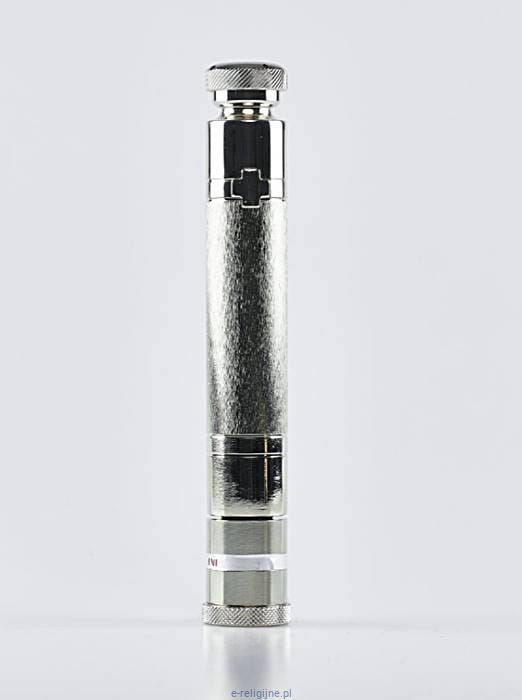 Metalowe kropidło o długości 18 cm połączone z pojemnikiem na oleje chorych.
