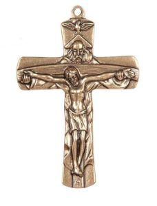 Krzyż metalowy pamiątka bierzmowania dla młodzieży z wizerunkiem Trójcy Świętej.