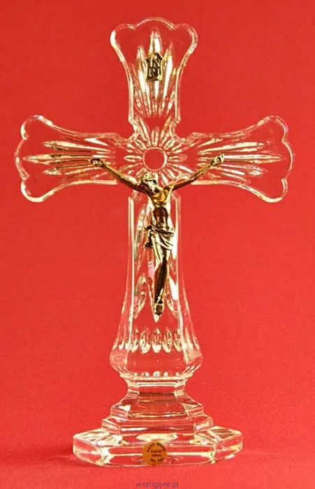 Krzyż kryształowy stojący, ręcznie wykonany z metalową figurą Chrystusa. Wysokość ok. 21cm, grubość ok. 2 cm, waga: ok. 0,7 kg.