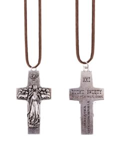 Napis "Duchu Święty umocnij mnie swoimi darami" to wyznanie wiary i prośba o wsparcie Ducha Świętego w codziennym życiu. Krzyż jest pięknym i widocznym znakiem, który może być zawieszony na ścianie lub noszony na szyi dzięki rzemykowi.
