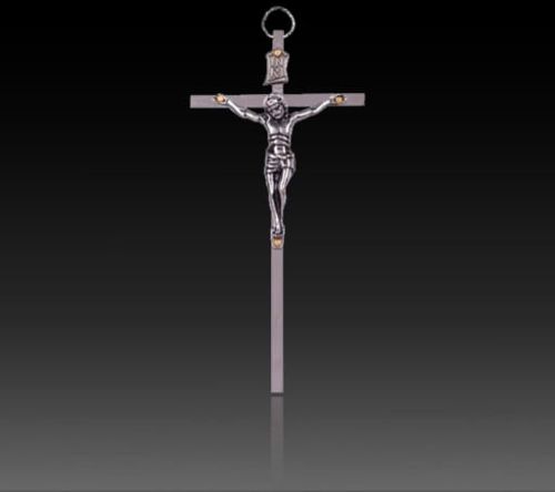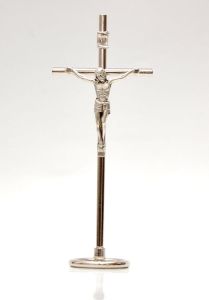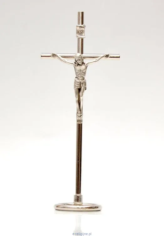 Krzyż stojący metalowy. Wysokość ok. 16 cm. Precyzyjnie wykonany, łatwy do przeniesienia, idealny na biurko, szafkę nocną. Produkt włoski.
