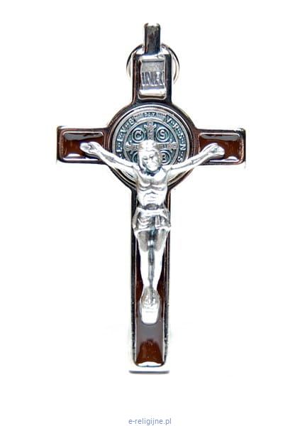 Krzyż św. Benedykta metalowy do zawieszenia na szyję. Wysokość krzyża ok. 8 cm. Kolor brązowy.