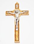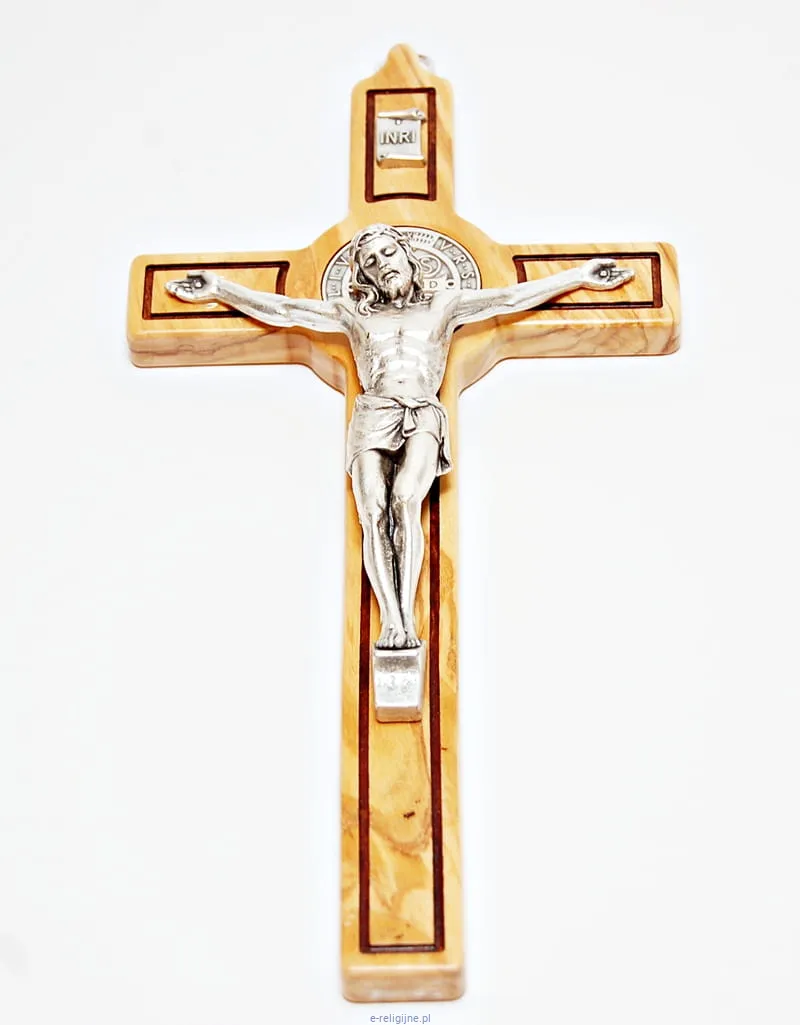 Krzyż św. Benedykta wykonany z drzewa oliwnego z metalową figurą Chrystusa. Możliwość powieszenia na ścianie, dzięki specjalnemu uchwytowi. Niezwykle staranne i estetyczne wykonanie. Wysokość krzyża 25 cm, szerokość 12 cm, grubość krzyża 1 cm.