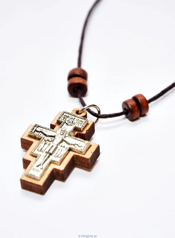 Drewniany krzyżyk San Damiano (krzyż św. Franciszka) na rzemyku do zawieszenia na szyję. Delikatny, lekki i praktyczny. Polecany szczególnie jako pamiątka bierzmowania.