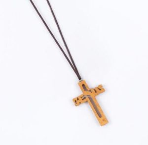 Estetyczny drewniany krzyżyk na szyję w kształcie Imienia Jezus. W komplecie rzemyk.