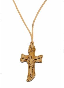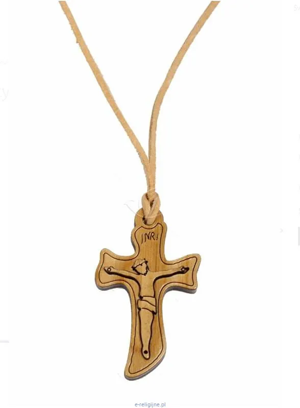Drewniany krzyżyk z rzemykiem z wizerunkiem Jezusa Chrystusa, najczęściej kupowany jako pamiątka bierzmowania.