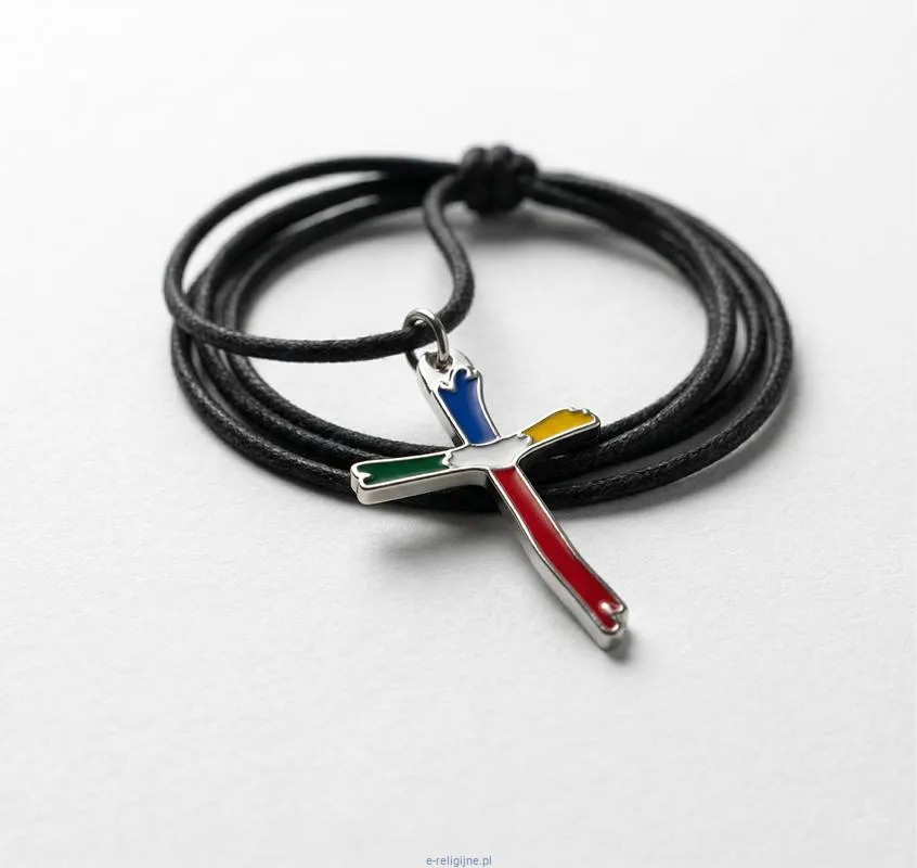 Krzyżyk misyjny emaliowany na sznurku (2,5 × 1,5 cm, grubość ok. 1 mm, metal w kolorze srebrnym, emalia w czterech kolorach kontynentów) to model, który polscy kapłani najczęściej wybierają jako pamiątkę bierzmowania — i jednocześnie jedyny krzyżyk, który bierzmowany nastolatek ma szansę nosić na co dzień, a nie schować do szuflady po ceremonii.