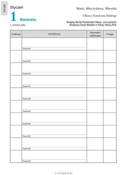 Do wpisywania przyjętych intencji Mszy Świętych na 2024 rok. Zawiera niezbędne rubryki, aby wpisać datę i godzinę Mszy, treść intencji czy nazwisko celebransa.