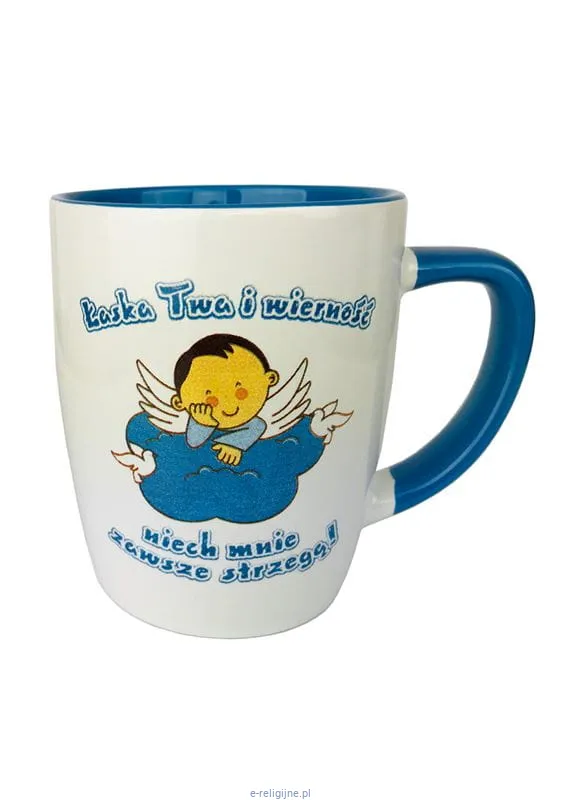 Chrześcijański kubek w kolorze białym z niebieskim wypełnieniem i niebieską rączką, z kolorowym nadrukiem.