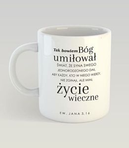 Pojemność 250 ml. Doskonały prezent na każdą okazję. Kubek ceramiczny z wygrawerowanym wersetem biblijnym z Ewangelii według świętego Jana "Tak bowiem Bóg umiłował świat, że Syna swego Jednorodzonego dał ..."