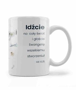 Kubek z biblijnym wersetem "Idźcie na cały świat i głoście Ewangelię ..." Mk 16,15