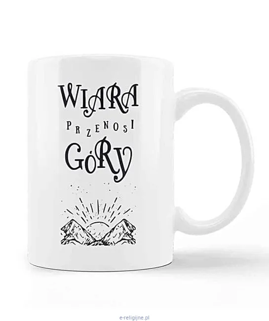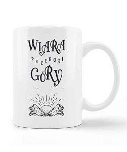 Kubek z chrześcijańskim cytatem "Wiara przenosi góry"