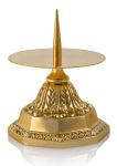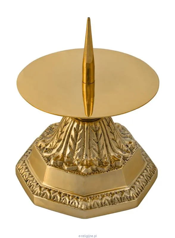Centralny szpic pozwala nabijać świecę, a płaski talerzyk wychwytuje spływający wosk. Format do ołtarzy bocznych, kaplic i mniejszych świątyń.