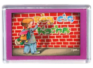 Magnes o grubości 5 mm z plastikową ramką, idealny do przymocowania na lodówkę lub inne metalowe powierzchnie. Wymiary 70/45 mm.