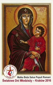 Obrazek Ikona Matka Boża Salus Populi Romani - symbol Światowych Dni Młodzieży w Krakowie kartonowy, format 6,5 x 9. Na odwrocie informacja o symbolach Światowych Dni Młodzieży oraz słowa świętego Jana Pawła II o symbolach.