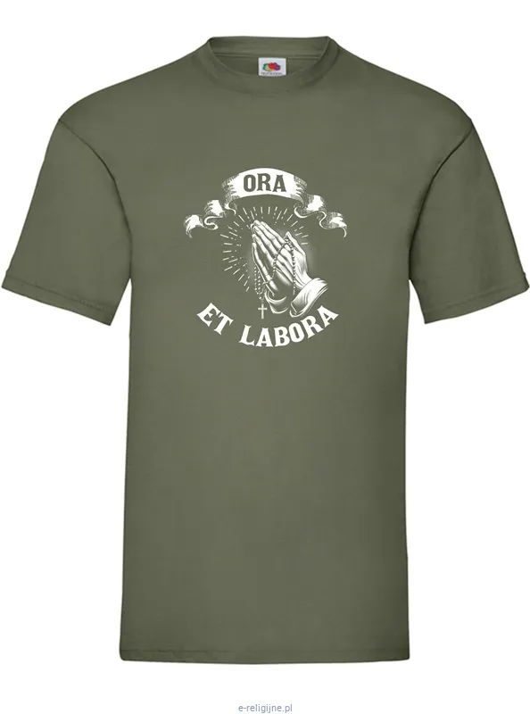 Bawełna 100%, gramatura 180 g/m² (kategoria Fruit of the Loom Original T). Nadruk biały sitodrukiem, centralnie na froncie: dłonie złożone do modlitwy z różańcem, napisy „ORA" i „ET LABORA" w bannerowej typografii, promienie i krzyżyk. Producent nie zaleca prania w pralkach automatycznych — pranie ręczne w letniej wodzie, suszenie płaskie. To wymóg wynikający z wykończenia tkaniny przy tej gramaturze i technice nadruku.