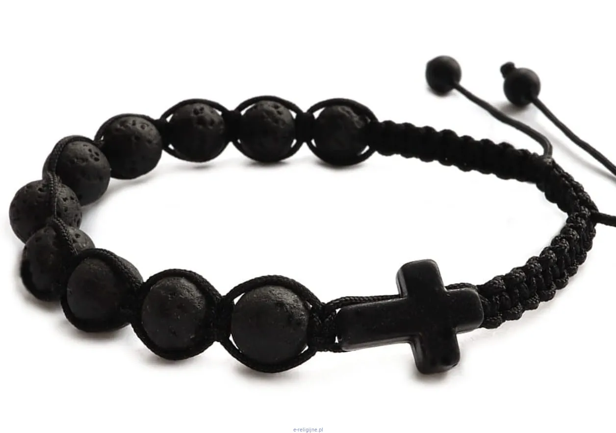 Męski różaniec na rękę - bransoletka z lawy wulkanicznej i krzyżem z howlitu 8761