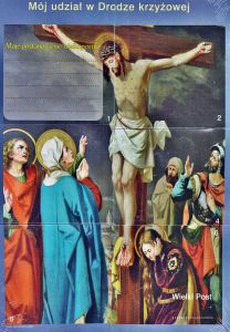 Sprawdziany na nabożeństwa Drogi Krzyżowej w formie wyklejanki. Dzieci otrzymują poszczególne części obrazka uczestnicząc w kolejnych nabożeństwach Drogi Krzyżowej w Wielkim Poście.