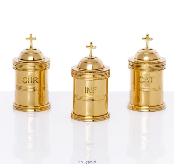 Zestaw trzech pojemników na oleje chorych, krzyżma i katechumenów.