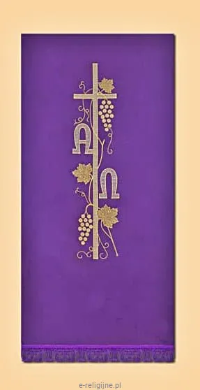 Nakrycie na ambonkę w kolorze fioletowym z haftem. Szerokość 60 cm. Długość z frędzelkami 195 cm.