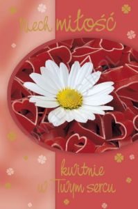 Tekst na pierwszej stronie: "Niech miłość kwitnie w Twym sercu" Życzenia umieszczone wewnątrz (lewa strona): "Wszyscy ludzie żyją nie dzięki trosce o siebie samego, lecz prze miłość, jaką żywią dla nich inni".