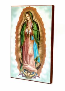 Obraz na desce z wizerunkiem Matki Bożej z Guadalupe. Obraz naklejony na drewnianą deskę o grubości ok. 1,7 cm i wymiarach 16 x 25 cm. Otwór z tyłu obrazu umożliwia powieszenie go na ścianie.