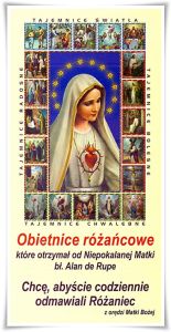 Obrazek z wizerunkiem Matki Bożej oraz obietnicami dla tych, którzy odmawiać będą różaniec, jakie otrzymał od Maryi bł. Alan de Rupe. Format obrazka 6,5 x 14. Paczka 100 sztuk.