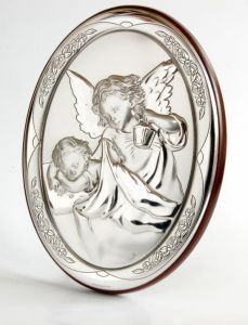 Srebrny obrazek z wizerunkiem Anioła Stróża. Produkt włoski, wyprodukowany przez firmę Asa Linea.