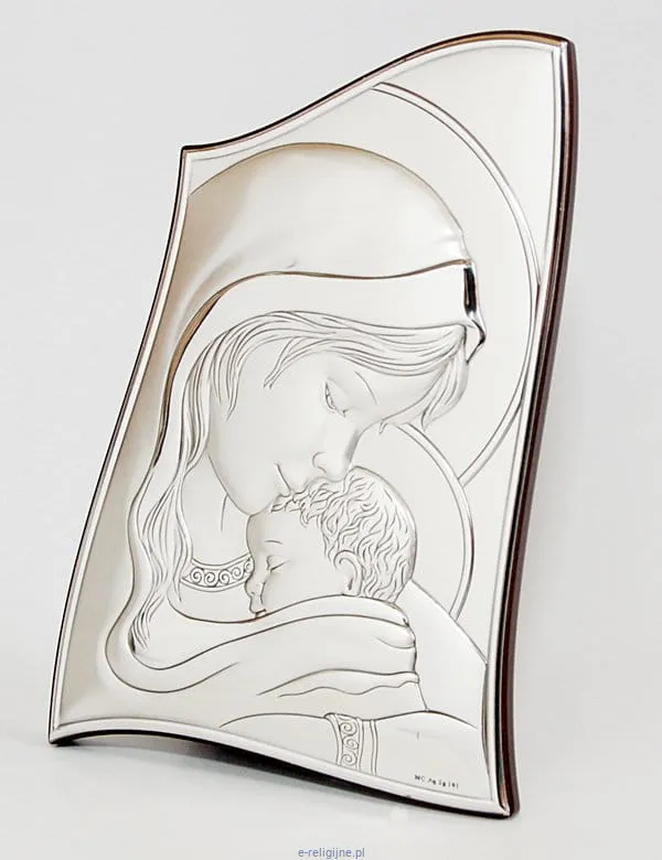 Srebrny obrazek z wizerunkiem Maryi z Dzieciątkiem. Produkt włoski, wyprodukowany przez firmę Valenti & Co.