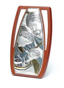 Srebrny obrazek z wizerunkiem Świętej Rodziny na drewnianej deseczce. Produkt włoski, wyprodukowany przez firmę Tangari.