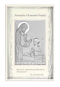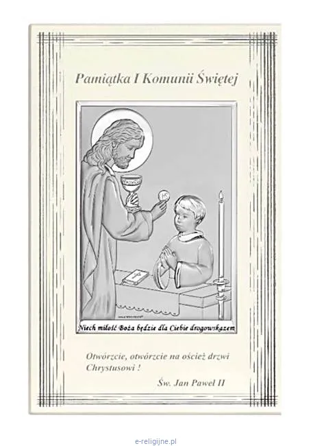 Obrazek Pamiątka Pierwszej Komunii dla chłopca na ozdobnym panelu z cytatem św. Jana Pawła II: Otwórzcie na oścież drzwi Chrystusowi.