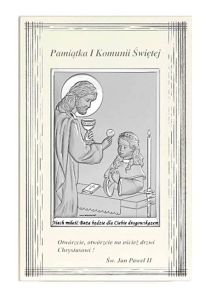 Obrazek Pamiątka Pierwszej Komunii dla chłopca na ozdobnym panelu z cytatem św. Jana Pawła II: Otwórzcie na oścież drzwi Chrystusowi.