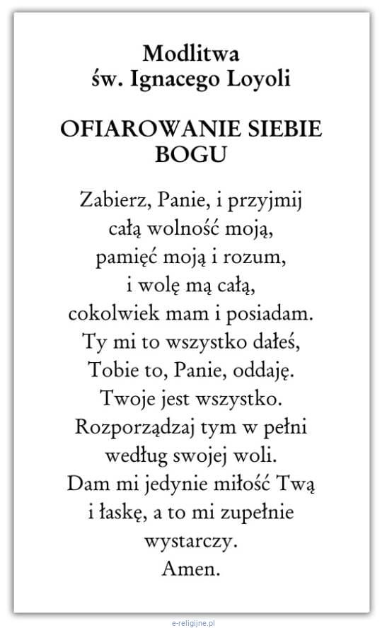 Na odwrocie obrazków modlitwa św. Ignacego: Zabierz, Panie, i przyjmij całą wolność moją, pamięć moją i rozum, i wolę moją całą, cokolwiek mam i posiadam. Ty mi to wszystko dałeś - Tobie to, Panie, oddaję. Twoje jest wszystko. Rozporządzaj tym w pełni wedle swojej woli. Daj mi jedynie miłość Twoją i łaskę, albowiem to mi wystarcza. Amen