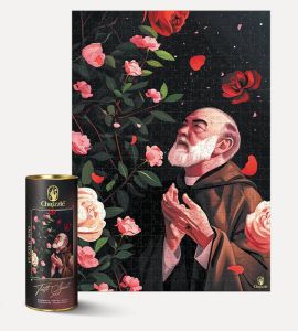 W ciszy nocy, wśród róż unoszących się ku gwieździstemu niebu, Ojciec Pio trwa w modlitewnej kontemplacji. Każdy element tej układanki to fragment niezwykłej historii świętego, który już za życia był tak blisko nieba.
