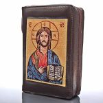 Skórzana okładka z ikoną Chrystusa Pantokratora na Pismo Święte - Biblię Tysiąclecia - Pallotinum, wydanie V, format oazowy 11,5 x 18 cm. Okładka pasuje również na brewiarz kapłański tomy II - IV oraz brewiarz skrócony.