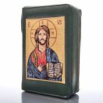 Okładka na Pismo św. z ikoną haftowaną ze skóry - (ZIELONA PANTOKRATOR) - format oazowy